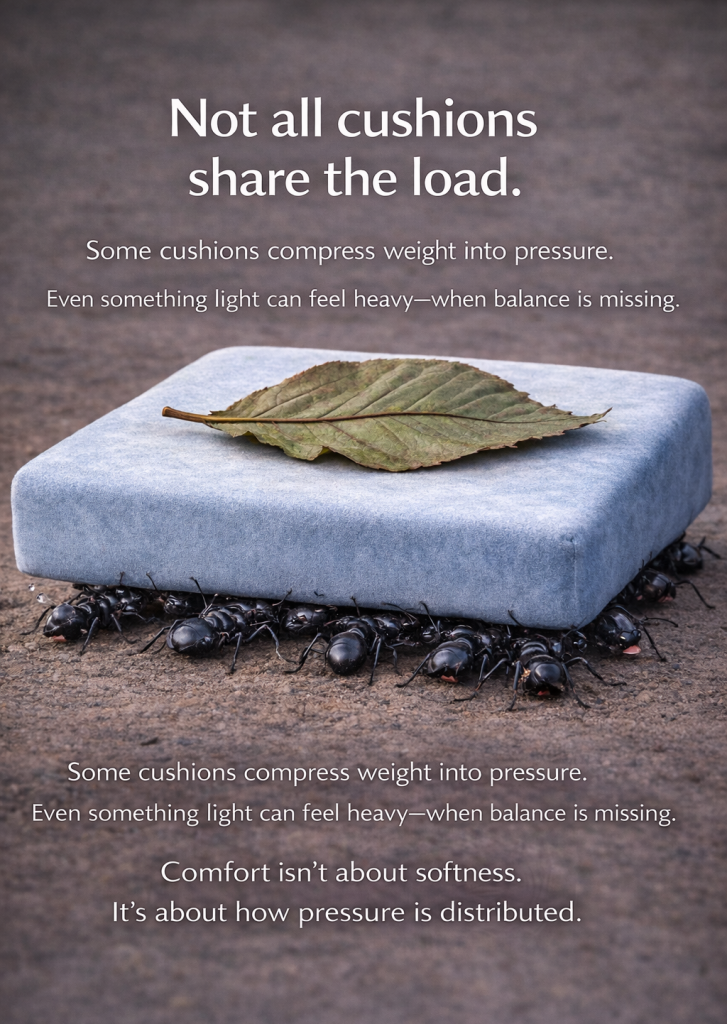 This is the idea behind the image of ants struggling beneath a cushion and a leafโa quiet reminder that comfort isnโt defined by softness alone, but by how pressure is handled underneath.