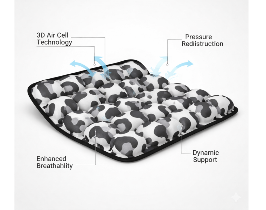- Customized Pressure Relief: When you sit, air flows between the cells to distribute your weight evenly, effectively eliminating “hot spots” of pain on the tailbone.