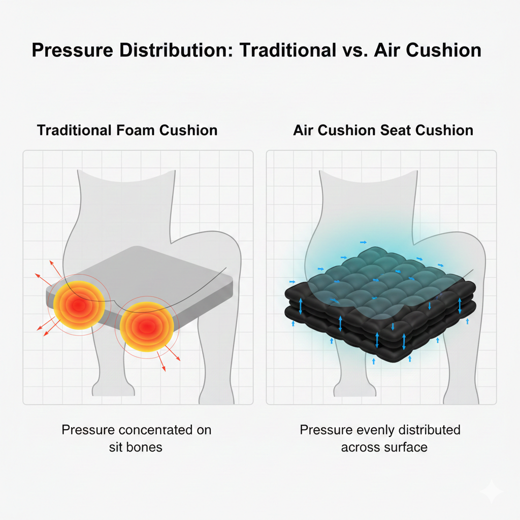 Air cushion seat cushions typically consist of multiple interconnected air cells. When you sit down, air flows between these cells, automatically adjusting to the shape of your buttocks, thereby distributing the pressure that would normally concentrate on two points evenly across the entire contact surface.