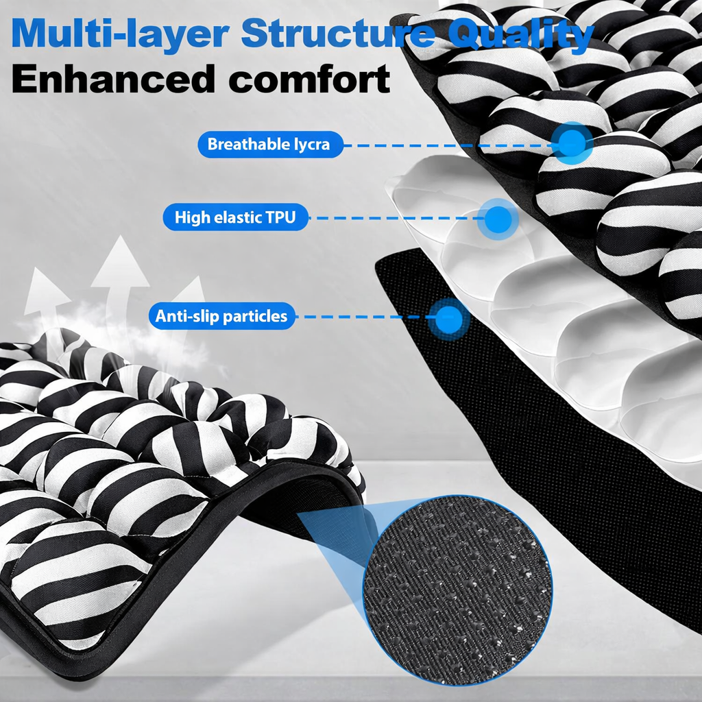 The zebra-patterned air cushion features 42 individual air cells, designed to adapt naturally as you sit, shift, or lean. This helps reduce concentrated pressure on the hips and lower body, supporting a more balanced sitting posture throughout the day.
