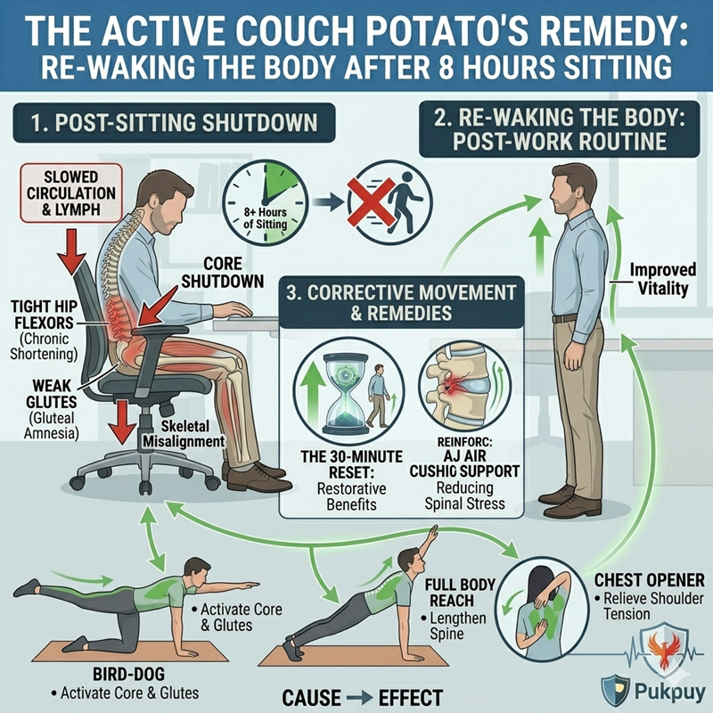 - The “C-Shape” Danger: This prolonged spinal rounding strains the posterior muscles and overstretches the spinal cord, leading to the chronic “sofa ache” many people ignore.